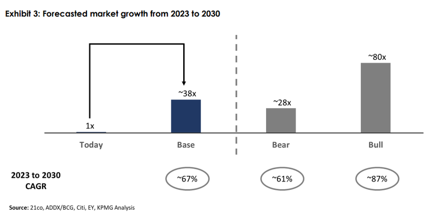 KPMG의 보고서에 따르면, 글로벌 비유동 자산의 토큰화 잠재력은 수조 달러 규모의 기회라고 합니다. 이 시장은 2030년까지 크게 성장할 것으로 예상되며, 2023년 기준치 대비 최소 28배에서 최대 80배까지 증가할 것으로 전망됩니다. 도입 확대와 긍정적인 규제 논의도 이러한 성장을 더욱 촉진할 것입니다.