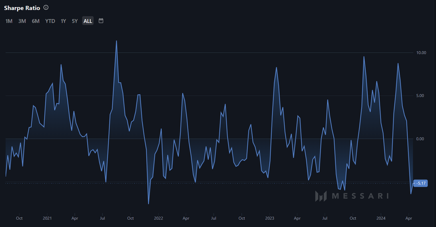 이를 위해서는 해당 자산이 수익성 있고 매력적인 투자 옵션이어야 하는데, 현재 DOT는 그렇지 않은 것 같습니다. 샤프 비율은 현재 -5.17로 이를 증명합니다. 샤프 비율은 투자 또는 포트폴리오의 위험 조정 수익률을 측정합니다. 투자 전략의 효율성에 대한 통찰력을 제공합니다.