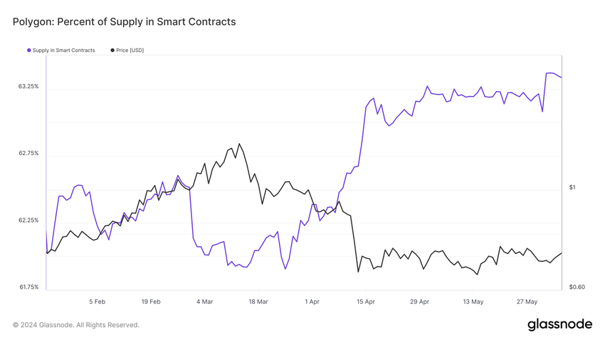 지난 두 달 동안 전체 공급량의 거의 2%가 스마트 콘트랙트에 할당되었습니다. 이러한 스마트 콘트랙트 활동의 증가는 네트워크 사용이 더욱 활발해져 가격에 긍정적인 영향을 미칠 수 있음을 시사합니다. 이 지표를 모니터링하면 네트워크의 상태와 MATIC에 대한 잠재적 수요에 대한 인사이트를 얻을 수 있습니다.