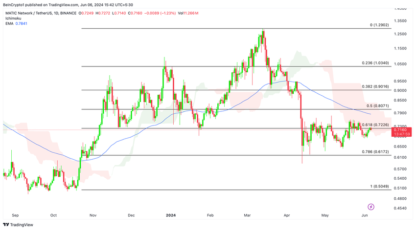 1일 차트를 사용하여 폴리곤(MATIC)의 가격 변동을 EMA 100, 이치모쿠 베이스라인, 이치모쿠 클라우드에 초점을 맞춰 분석해 보겠습니다.