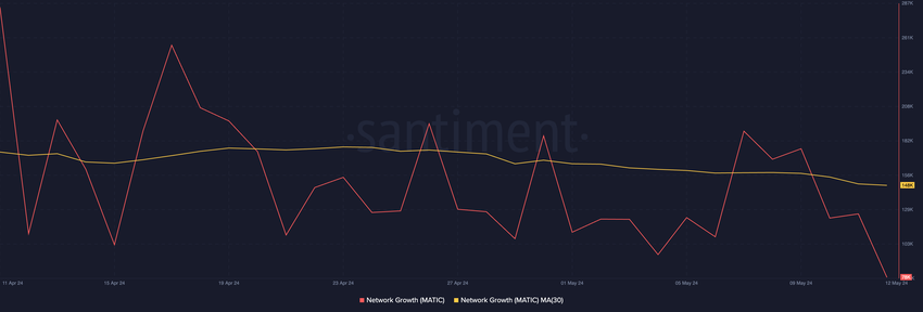 검토 대상 기간에는 MATIC에 대한 수요도 감소한 것으로 나타났습니다. MATIC 거래를 위해 생성된 일일 신규 주소 수를 추적하는 MATIC의 네트워크 성장률은 4월 20일 이후 감소했습니다. 4월 20일부터 5월 12일 사이에 MATIC에 대한 신규 수요는 15% 감소했습니다.