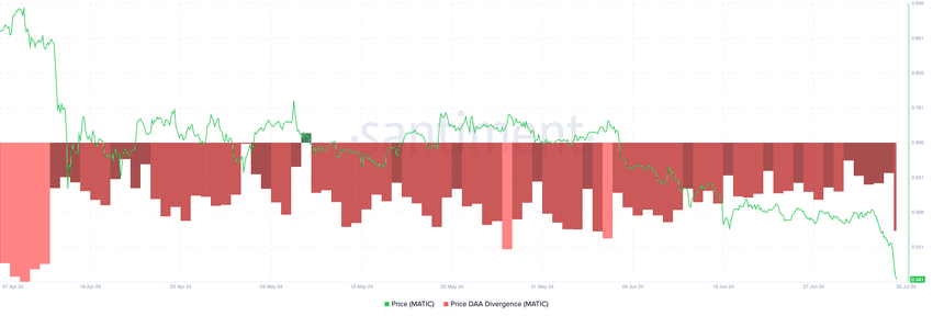 MATIC의 가격 하락과 음의 가격 DAA 다이버전스를 종합하면 폴리곤에서 토큰의 가격과 네트워크 활동이 모두 감소하고 있음을 알 수 있습니다.