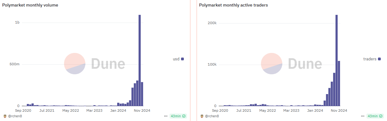 월간 거래량의 증가는 2024년 선거가 폴리마켓에서의 참여를 촉진한 방식을 반영합니다. 많은 사람들이 예측할 수 없는 정치적 환경에서 결과에 베팅하고자 합니다.