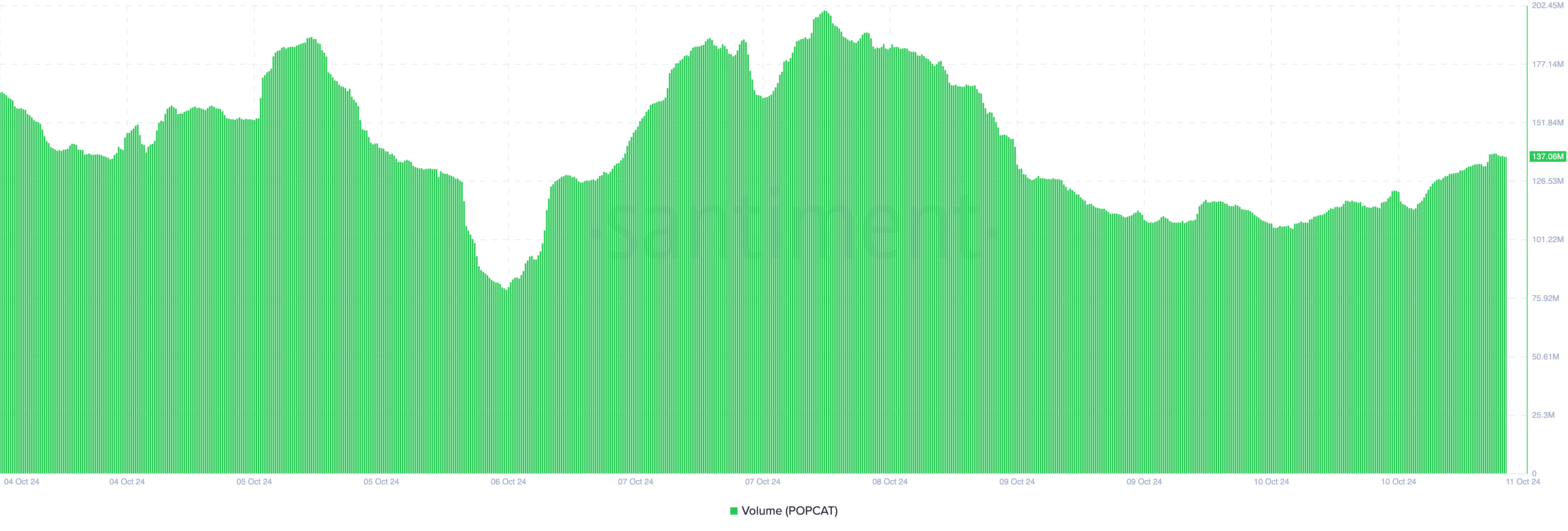 이 외에도 센티멘트의 온체인 데이터에 따르면 팝캣의 거래량이 다시 증가하기 시작했습니다. 거래량은 시장이 암호화폐를 얼마나 자주 사고파는지를 측정합니다.