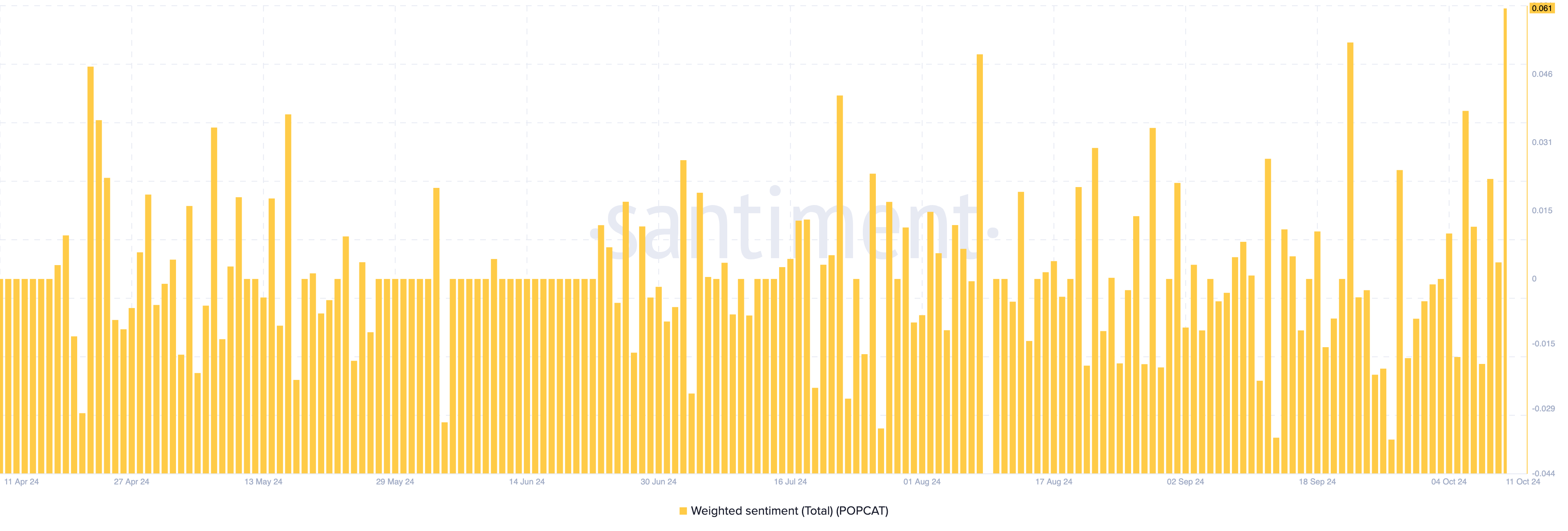 가중 감정의 상승은 POPCAT과 관련된 게시물과 메시지가 대부분 강세임을 시사합니다. 이것이 지속된다면 밈코인에 대한 수요가 증가하고 결국 가격을 더 높일 수 있습니다.