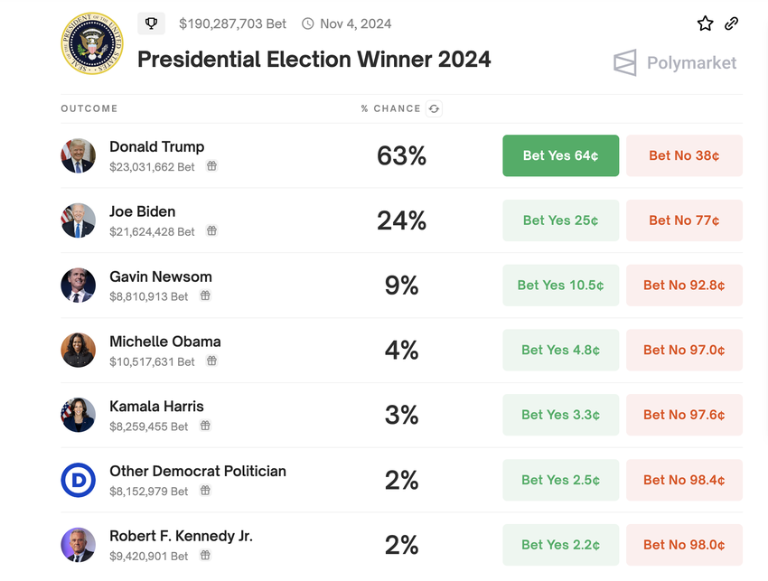 예측 시장인 폴리마켓에 따르면 2024년 대통령 선거에서 트럼프가 승리할 확률이 높아졌습니다. 현재 63%입니다.