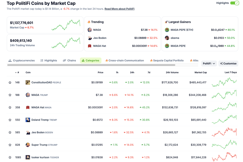 그 결과, 정치 테마(폴리티파이) 밈 코인은 상당한 타격을 입었습니다.
