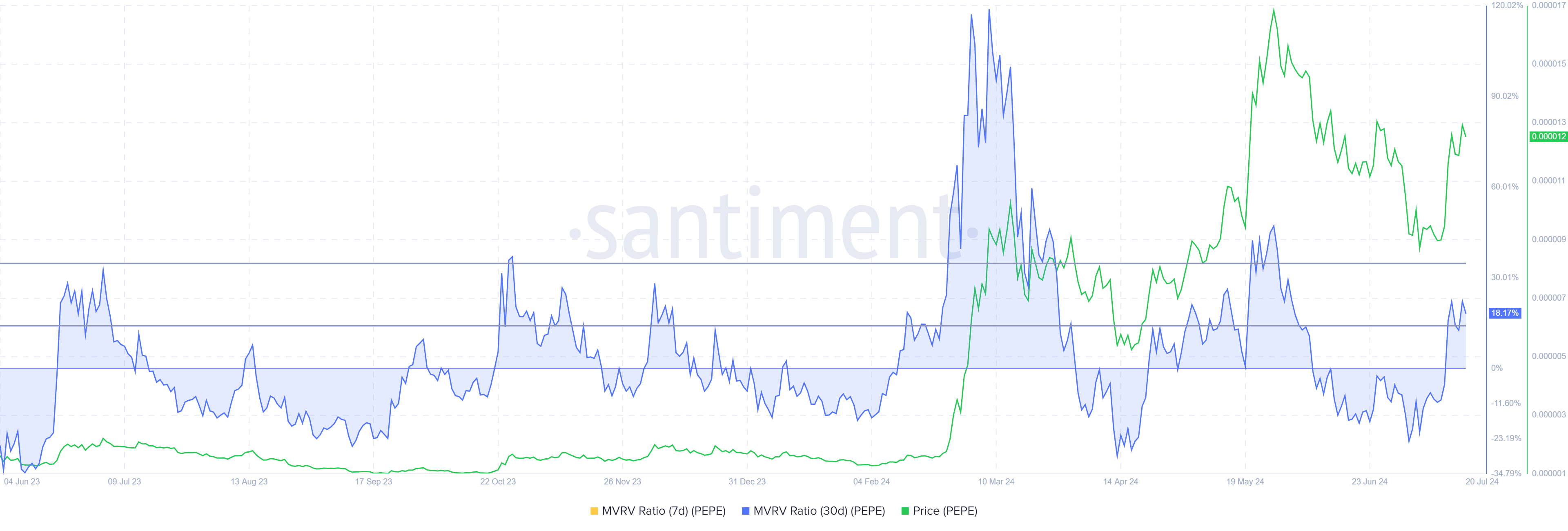 현재 PEPE의 30일 MVRV는 18%로, 수익성과 잠재적인 매도 압력을 나타냅니다. 역사적으로 PEPE는 종종 위험 구간으로 불리는 14%에서 34% 사이에서 조정되는 경향이 있습니다.