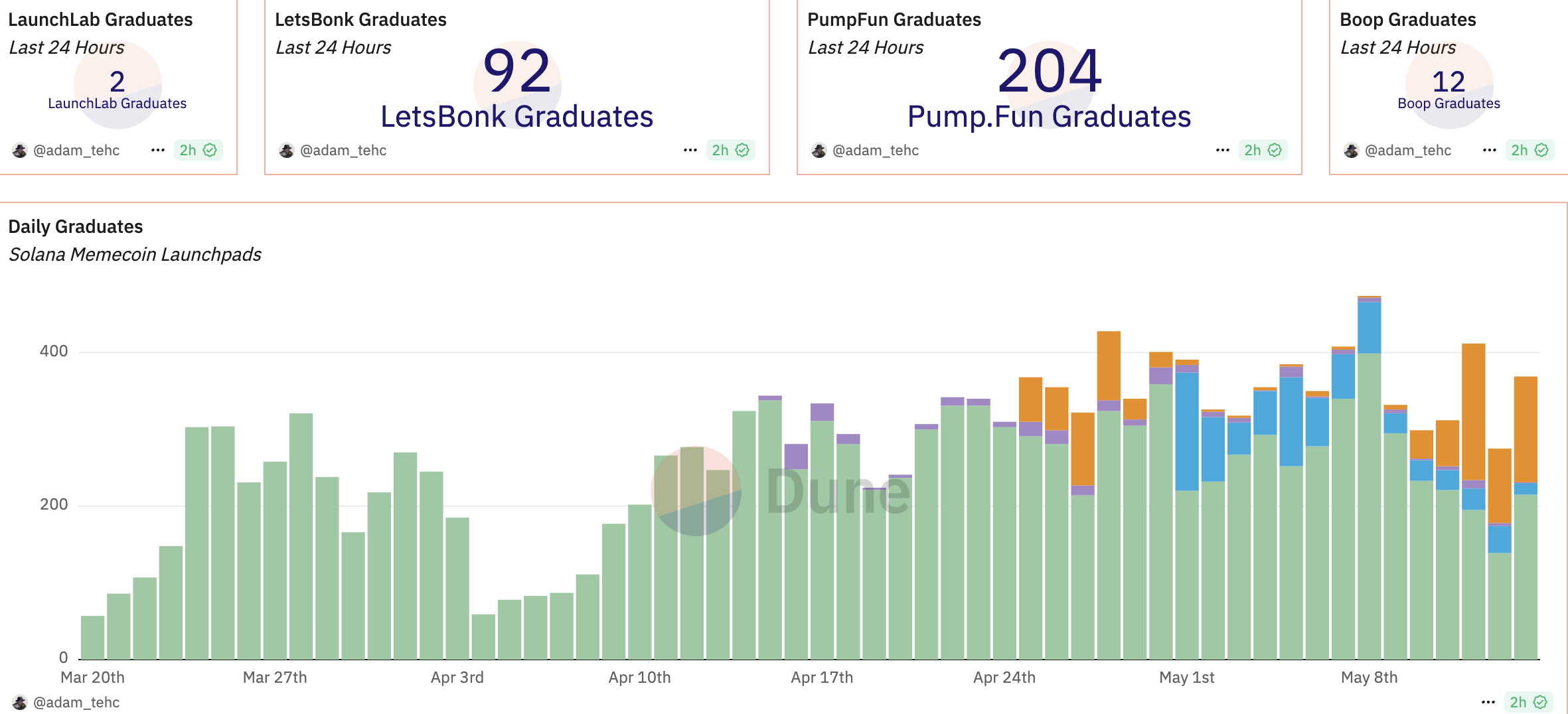 토큰 “졸업”률은 밈코인 런치패드의 효과성을 평가하는 중요한 지표입니다. 지난 24시간 동안 펌프펀은 204개의 토큰이 “졸업”하여 거래량에서 선두를 달리고 있습니다. 그러나 렛츠본크는 92개의 토큰으로 그 뒤를 바짝 쫓고 있으며, 런치랩(2개 토큰)과 부프(12개 토큰)를 훨씬 능가하고 있습니다.