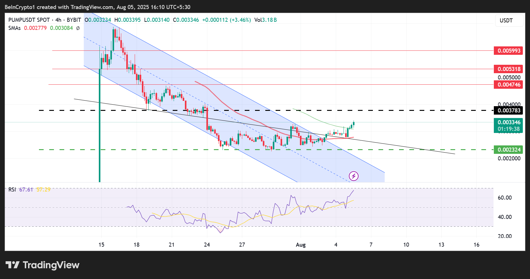 TradingView의 데이터에 따르면, PUMP 가격은 몇 주간의 저항을 벗어나 이를 지지로 전환했으며, 이제 $0.003783의 장애물을 목표로 하고 있습니다.