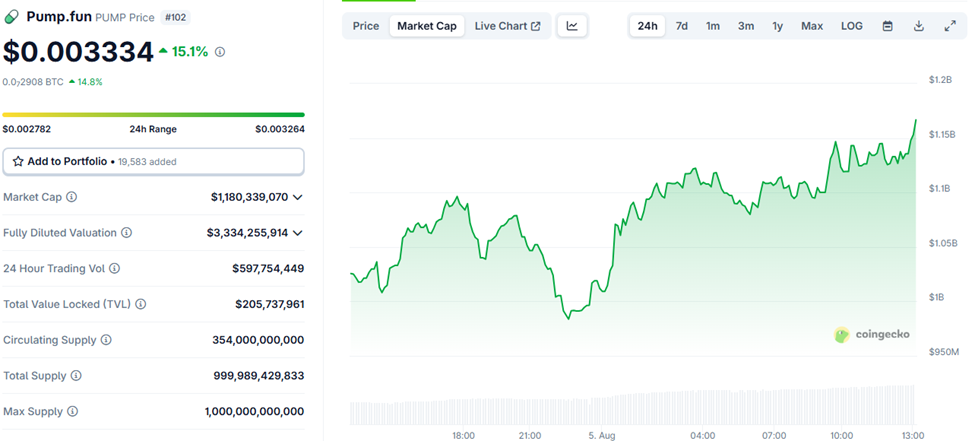 도지코인(DOGE)과 시바이누(SHIB) 같은 선구적인 밈코인들이 한 자릿수 상승에 그치는 동안, PUMP 토큰은 약 15% 상승했습니다. 현재 0.003334달러에 거래되고 있습니다.