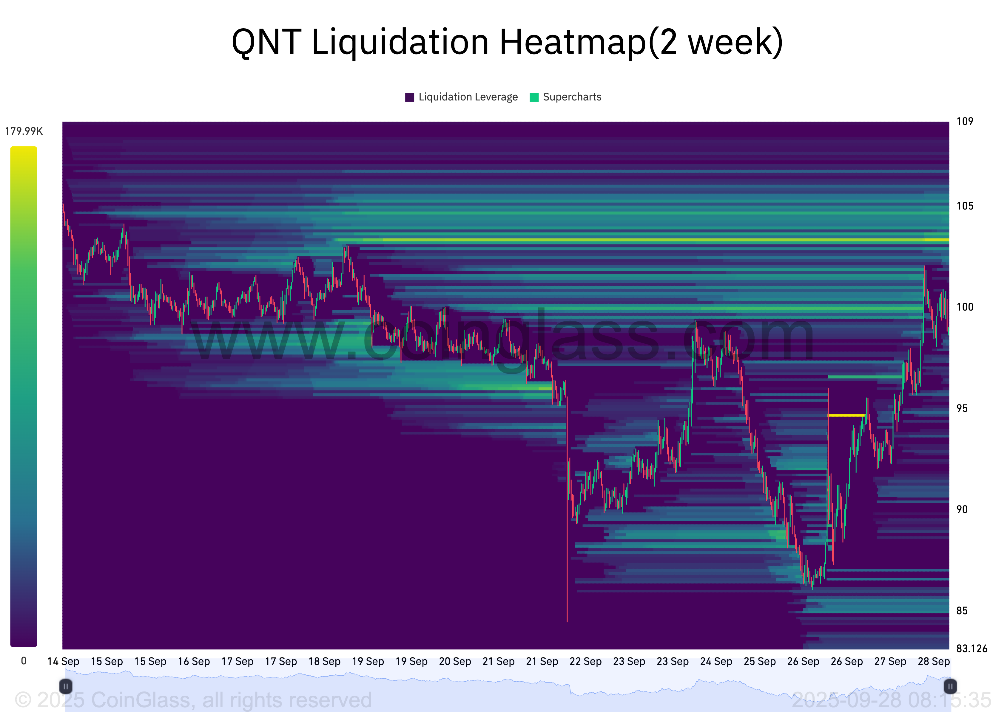 또한, QNT의 청산 히트맵은 현재 수준 위 약 $103에 유동성이 집중되어 있음을 강조합니다.