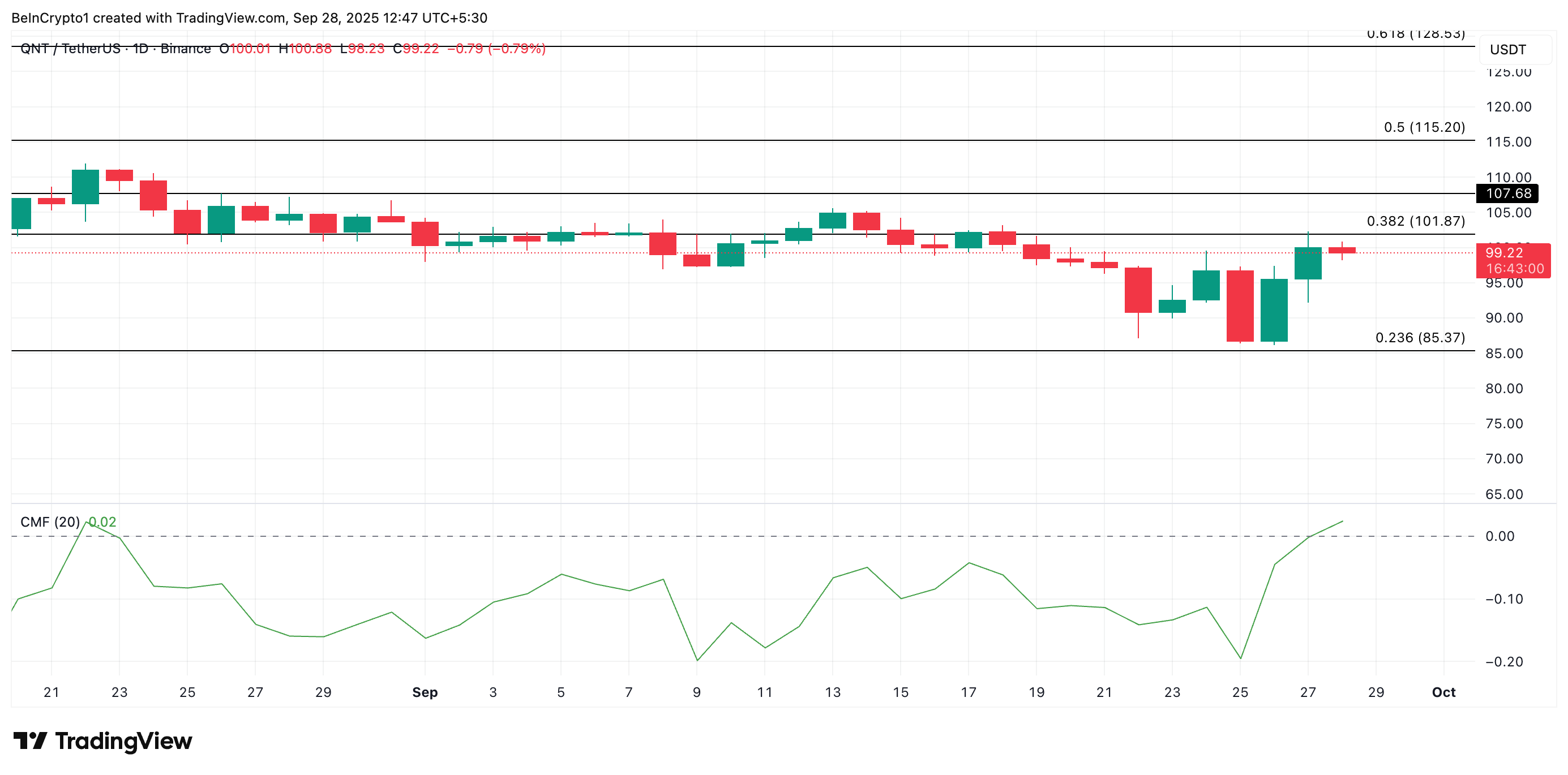 일일 차트에서 QNT의 차이킨 머니 플로우(CMF) 지표가 상승세를 보이며 지속적인 랠리를 지지하고 있습니다. 현재 이 모멘텀 지표는 0.02에 위치해 있습니다.