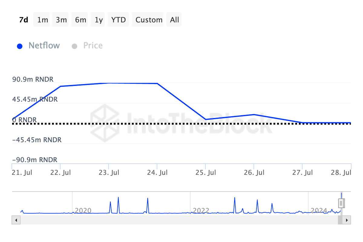 또한, 렌더 고래는 지난 주에 위험 노출을 줄였습니다. 해당 기간 동안 토큰의 대량 보유자 순유입은 99% 감소했습니다.