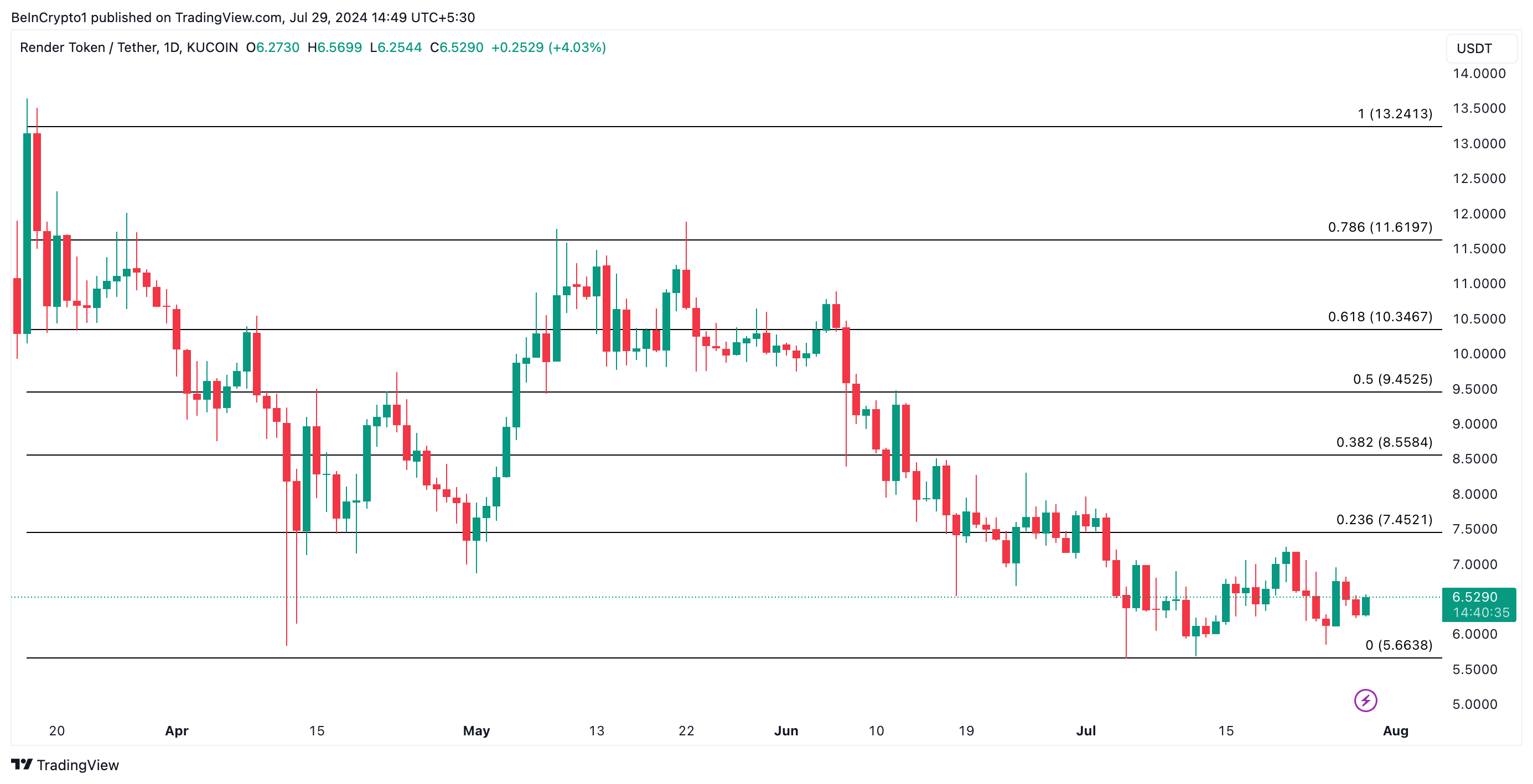 반면에 누적이 증가하면 현재 추세가 수정될 수 있으며, 렌더의 가격은 저항선인 7.45달러까지 상승할 수 있습니다.