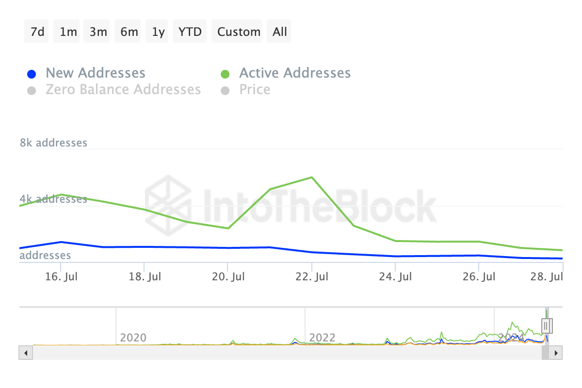 그러나 매도 압력이 매수 압력보다 커지기 시작하면서 렌더는 지지선까지 하락할 위험이 있으며, 잠재적으로 그 이하로 떨어질 수도 있습니다. 인투더블록의 온체인 데이터에 따르면 지난 주 토큰의 일일 활성 및 신규 주소 수가 크게 감소한 것으로 나타났습니다.
