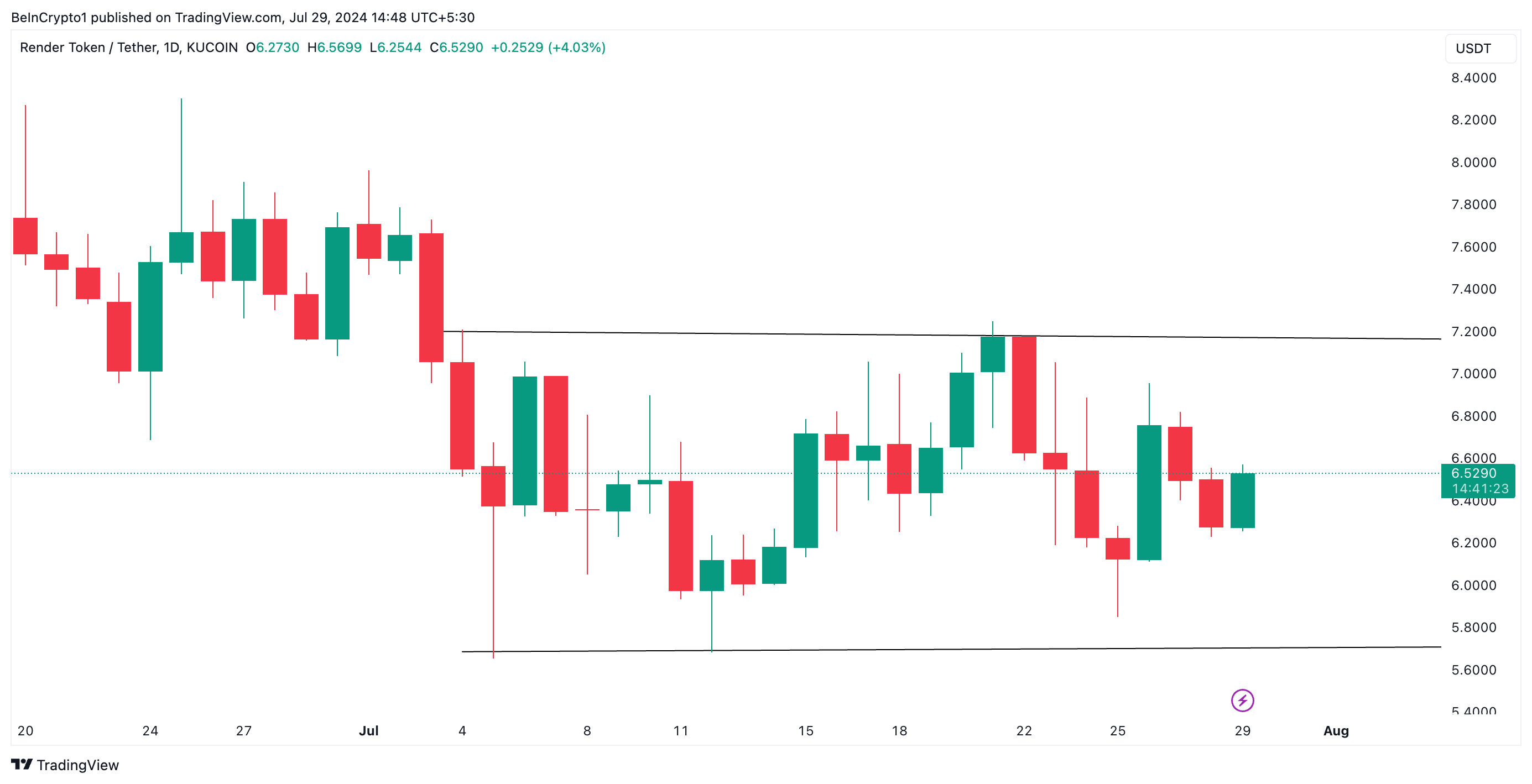 이 채널의 위쪽 선은 저항을 형성하고 아래쪽 선은 지지를 형성합니다. 7월 초에 가격이 횡보하기 시작한 이후 렌더는 7.20달러선에서 저항에 직면했고 5.70달러 부근에서는 지지선을 찾았습니다.