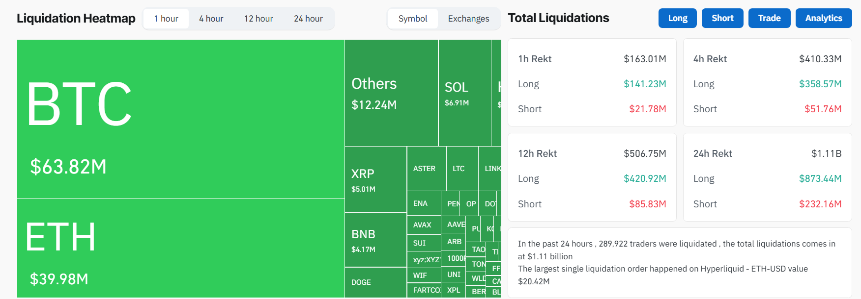 “지난 24시간 동안 289,922명의 거래자가 청산되었습니다. 총 청산액은 11억 1천만 달러입니다.” 코인글래스가 보고했습니다.