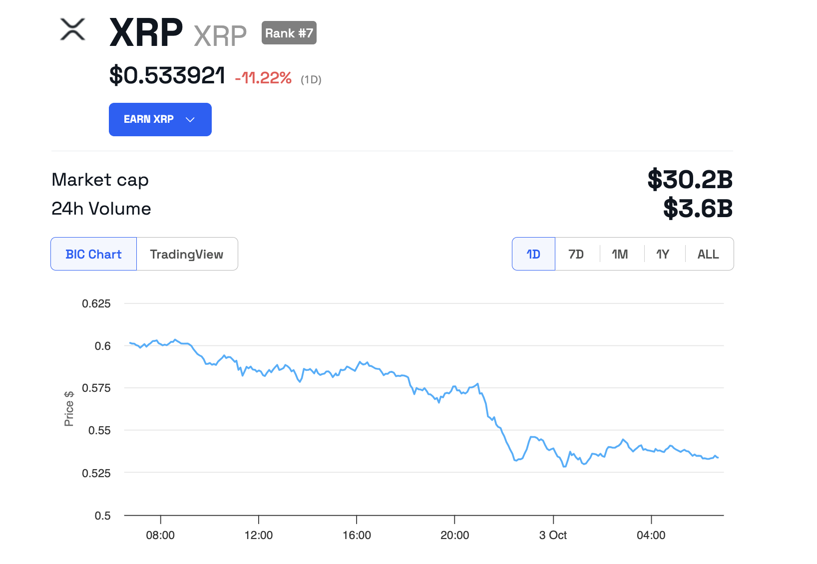 이러한 개발로 인해 XRP 토큰의 가격이 급락했습니다. 지난 24시간 동안 XRP는 11.22% 하락하여 현재 0.5339달러에 거래되고 있습니다.