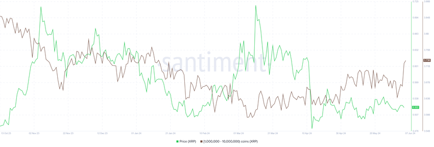 리플가격은 과거 고래 투자자들의상당한 영향력을 보여 왔으며, 앞으로도 마찬가지일 것으로 예상됩니다. 100만~1,000만 XRP를 보유한 주소는 지난 한 주 동안 1억 XRP 이상을 누적했습니다.