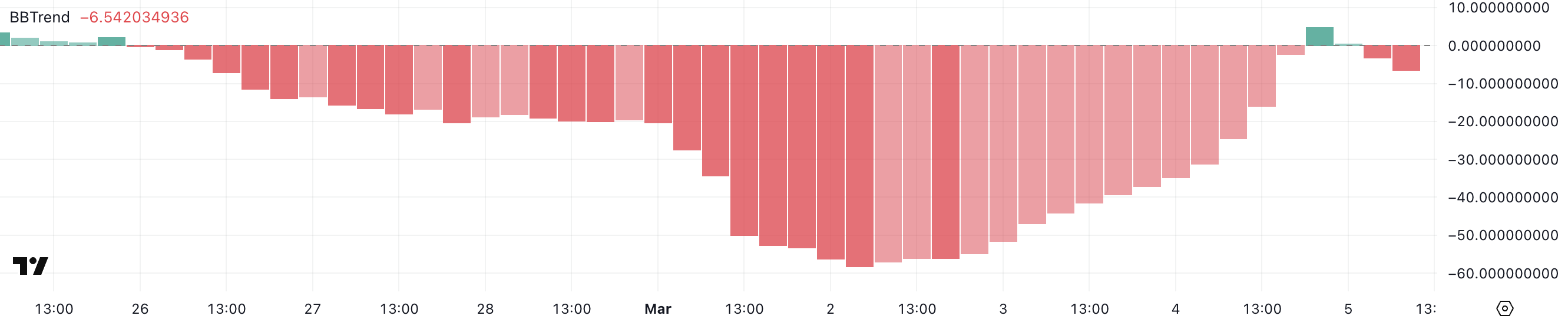 반대로, 음수 값은 가격이 하단 밴드 내에 있음을 나타내며, 이는 약세 추세를 반영합니다. SFM BBTrend가 현재 -6.54에 위치함에 따라, 3월 2일의 극단적인 약세 조건은 완화되었지만, 자산은 여전히 부정적인 단계에 있습니다.