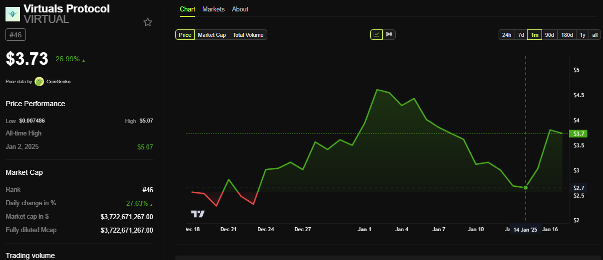 AI 에이전트의 물결을 타고 버추얼 프로토콜의 수요가 급증했습니다. BeInCrypto 데이터에 따르면, 버추얼스 프로토콜 생태계를 지원하는 토큰 VIRTUAL은 이 소식으로 거의 30% 상승했습니다. 작성 시점에서 3.73달러에 거래되고 있었습니다.