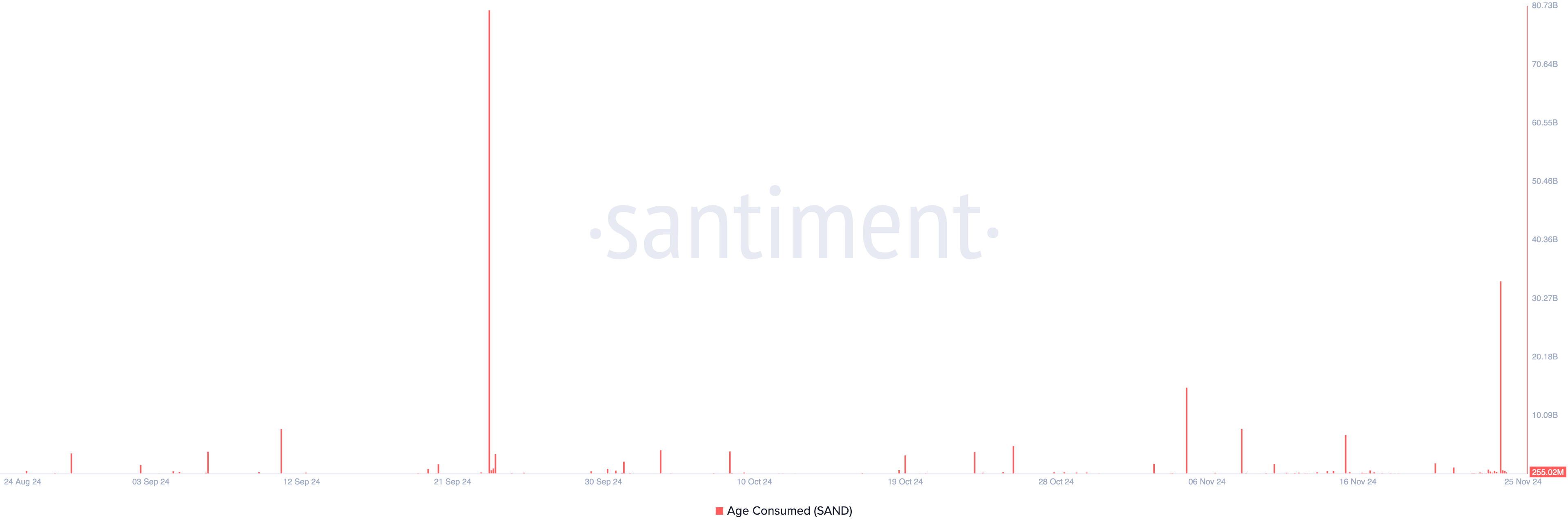 지난주 SAND의 가격 상승은 장기 보유자들이 이전에 비활성화된 토큰을 이동하게 했습니다. 이는 장기 보유 코인의 이동을 측정하는 토큰의 연령 소비 지표의 급등으로 나타납니다. 센티멘트에 따르면, 이는 일요일에 331억 9천만으로 두 달 만에 최고치를 기록했습니다.