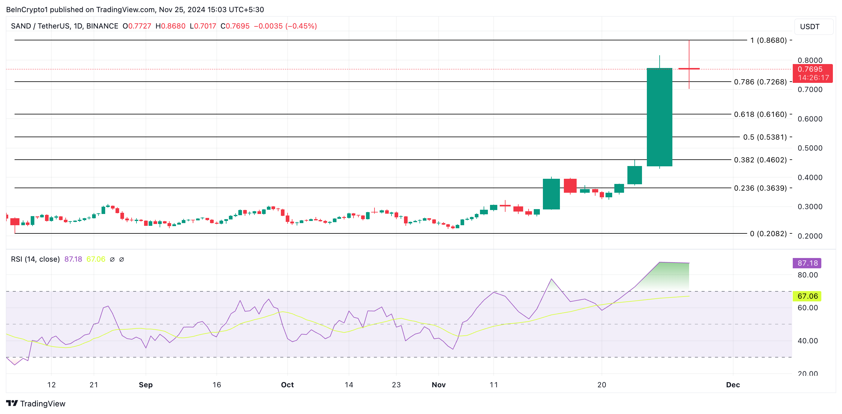 일일 차트에서 SAND의 상대 강도 지수(RSI)는 87.18로 과매수 상태를 나타냅니다. RSI는 자산이 과매도 또는 과매수 상태인지 측정하며, 0에서 100까지 범위입니다. 70 이상은 자산이 과매수 상태임을 나타내며 하락할 수 있고, 30 이하일 경우 과매도 상태로 반등할 수 있음을 시사합니다.