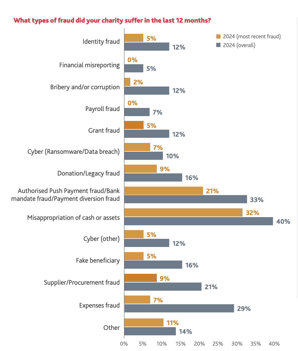 영국에 본사를 둔 BDO가 실시한 2024년 자선 사기 설문조사에 따르면, 139명의 응답자 중 42%가 사기 사례를 보고했습니다. 자선단체 내부의 개인이 50%의 사기 행위를 저질렀습니다. 동시에 가장 자주 보고된 사기 유형은 현금이나 자산의 부적절한 사용이었습니다.