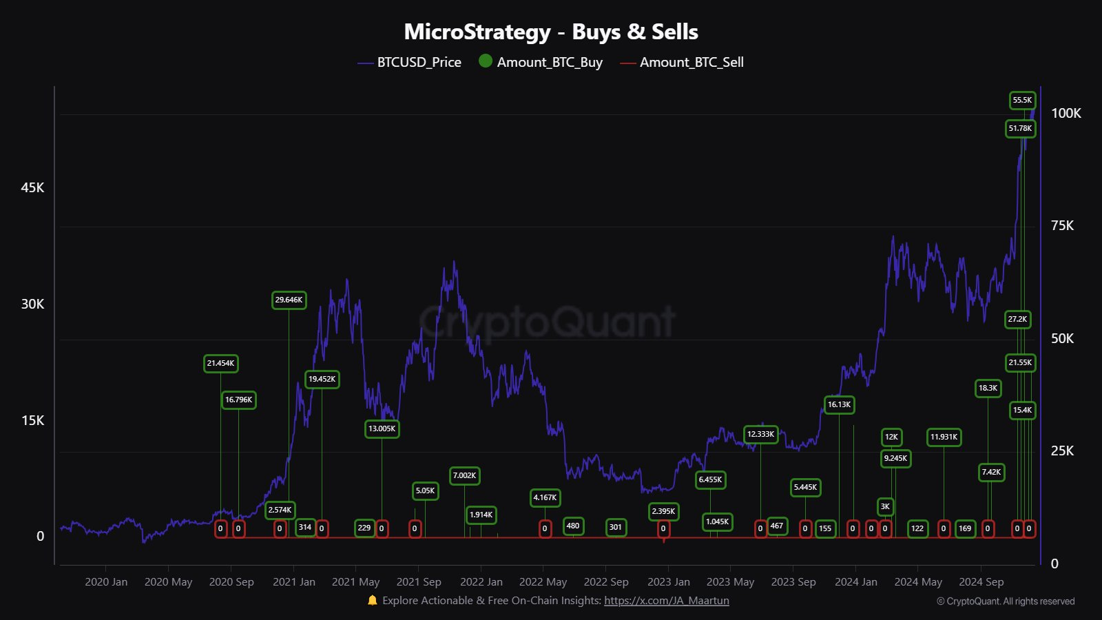 12월 15일, 세일러는 자신의 엑스(X, 옛 트위터)에 세일러트래커 차트 이미지를 올리며, 빠져있는 부분이 있다고 지적했습니다. 세일러의 이런 화법은 전통적으로 그가 추가 비트코인 매수를 했다는 것을 암시합니다.