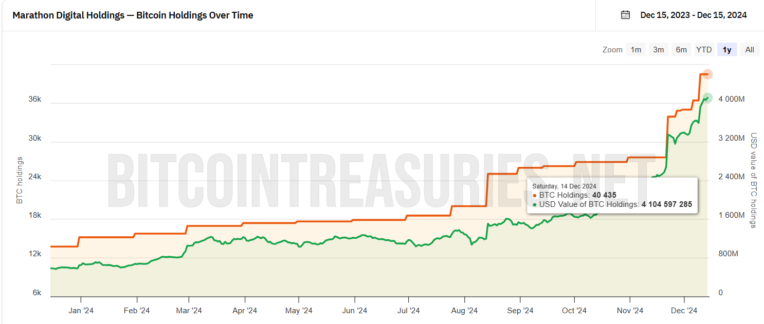 마라톤은 여전히 100억 달러 미만의 현재 시가총액으로 어려운 길을 앞두고 있습니다. 이는 마이크로스트래티지가 포함되기 전에 달성한 수치에 비해 훨씬 낮습니다. 그러나 마라톤은 비트코인 전략을 공격적으로 확장했습니다. 이번 달에 10억 달러 이상을 지출하여 보유량을 4만435 BTC로 늘렸으며, 현재 약 39억 달러로 평가됩니다.