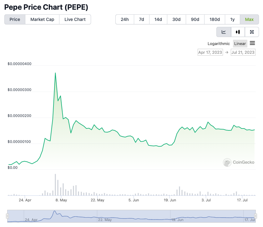 보고서에 따르면, 페페(Pepe)는 출시 이후 최고 수익률 1813배를 기록하며 전체 암호화폐 수익률 1위를 차지했다. 바이낸스 상장 이후에는 시가 총액이 18억 달러에 달하기도 했다. 그 이후, 5월 초 고점 대비 65% 하락했다.