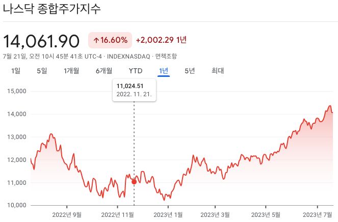 21일(현지시각) 미국 나스닥 종합주가지수는 올해 초 대비 38% 이상 상승한 1만 4066포인트를 기록했다. 나스닥 지수는 2021년 11월 이후 사상 최고치인 1만 6000포인트에 다가가고 있다.