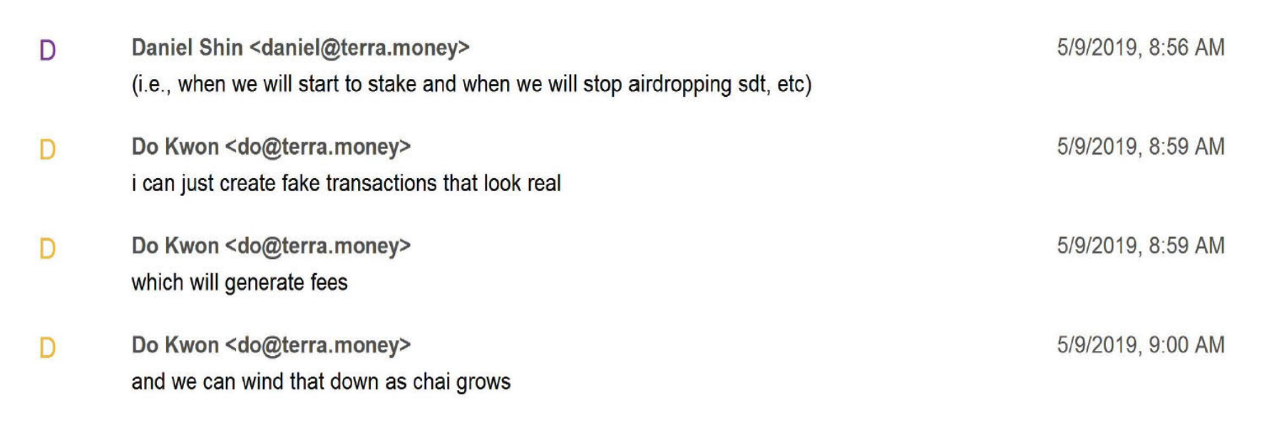 다만 SEC가 밝힌 문자 메시지에서 권도형은 신현성에게 “진짜처럼 보이도록 가짜 거래를 만들 수 있고 그렇게 하면 수수료 수익도 올릴 수 있다(I can just create fake transactions that look real…which will appear real and generate fees)”고 말했다.