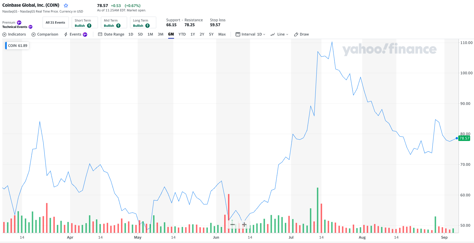 이어 지난달 29일에는 그레이스케일이 SEC를 상대로 승소하면서 같은 날 코인베이스 주가가 18% 추가로 올라 86달러를 기록하기도 했다.