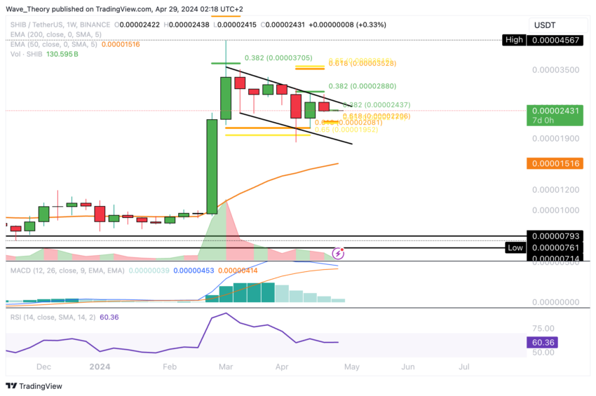 시바이누는 최근 약 $0.0000248에 위치한 50일 EMA의 중요 지지선을돌파했으며, 현재 약 $0.0000244인 .382 Fib 수준에서 상당한 지지선을 모색하고 있습니다. 이 레벨은 강세 반등을 위한 플랫폼 역할을 할 수 있으며, 잠재적으로 50일 EMA 저항을 목표로 할 수 있습니다.