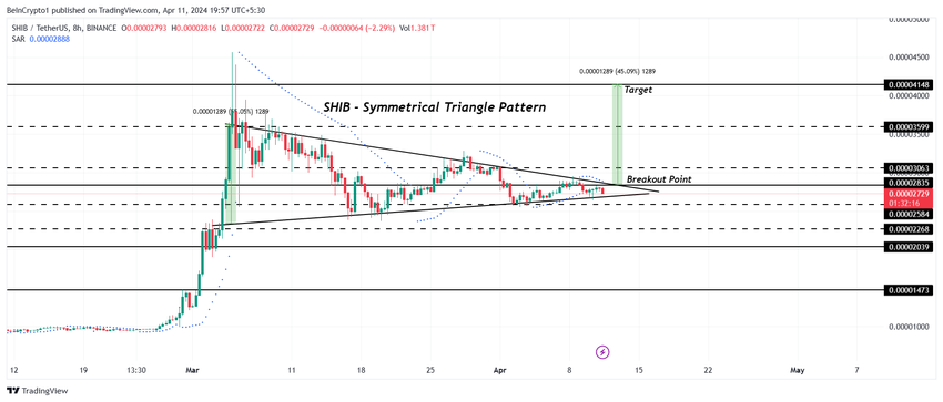 시바이누의 가격은 대칭 삼각형 패턴을돌파하려고 시도합니다. 이는 추세선이 수렴하는 것을 특징으로 하는 기술적 분석 형태로, 잠재적 돌파 전 바닥을 다지는 기간을 나타냅니다.