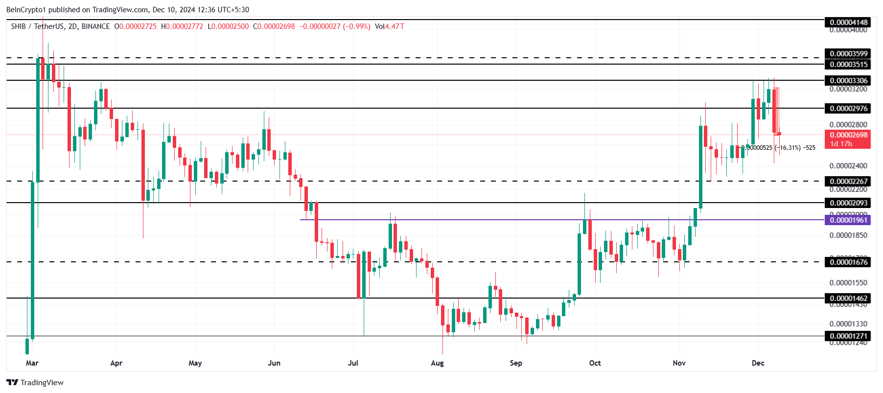 시바이누의 가격은 지난 24시간 동안 16% 하락하여 현재 0.00002698달러입니다. 이 하락은 알트코인을 이전 지지선인 0.00002976달러 아래로 밀어냈습니다. 이 주요 지지선을 유지하지 못한 것은 시장 심리의 잠재적 변화를 나타내며, 추가 가격 약세로 이어질 수 있습니다.