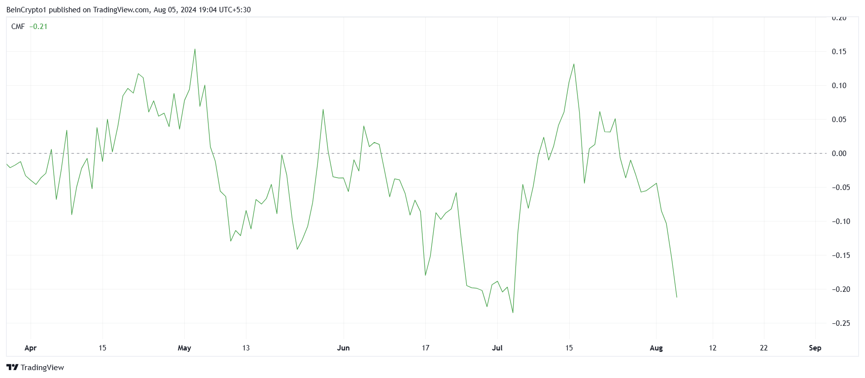 차이킨 자금 흐름(CMF)은 시바이누 투자자들이 적극적으로 투자금을 회수하고 있음을 보여줍니다. 이러한 상당한 자금 유출 추세는 투자자층의 경계심이나 불만이 커지고 있음을 보여줍니다.