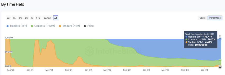 데이터에 따르면 시바 이누(SHIB) 토큰 보유자의 75%가 1년 이상 투자를 유지한 것으로 나타났습니다.