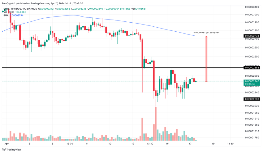 현재 SHIB는 좁은 수평 채널을 탐색하고 있으며, 중요한 저항선은 $0.00002383 입니다. 이 임계값을 돌파하면 0.00002734 까지 21% 상승할 수 있으며, 이는 4시간 차트에서 200 단순이동평균과 일치하는 수준입니다.