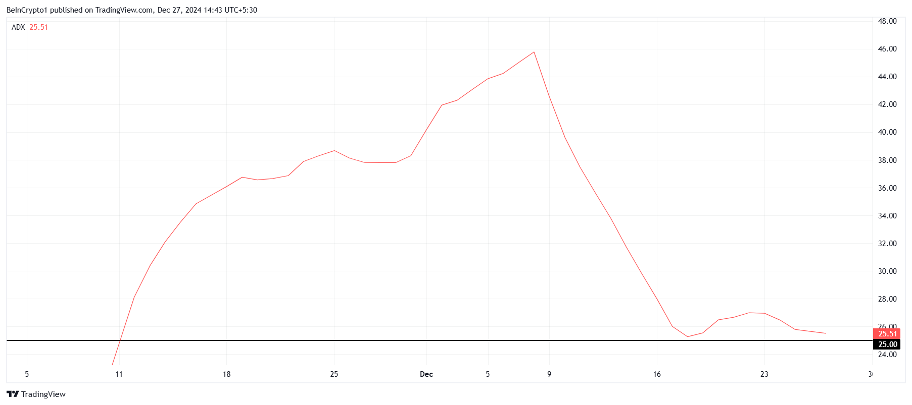 시바이누의 거시적 모멘텀은 추세의 잠재적 변화를 시사합니다. 현재 25.0 임계값에 있는 평균 방향성 지수(ADX)는 진행 중인 하락 추세가 힘을 잃고 있음을 나타냅니다. 이 수준 아래로 떨어지면 하락 압력이 끝나고 SHIB의 가격 회복을 위한 여지가 생길 것입니다.
