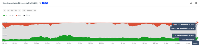 SHIB 보유자들은 상승을 확신하지 못하고 있으며, 이는 그들의 행동에서 분명하게 드러납니다. 투자자들은 가능한 모든 이익을 확보하기 위해 보유 자산을 매도하는 데 열을 올리고 있습니다. 수익성별로 활성 주소를 관찰하면 네트워크에서 거래를 수행하는 모든 투자자의 약 20%가 수익을 내고 있음을 알 수 있습니다.