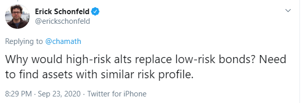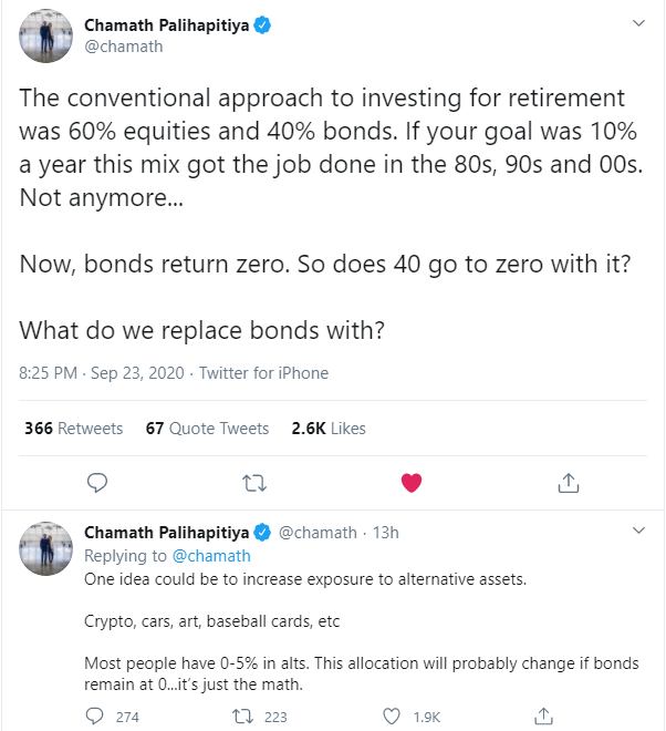 소셜캐피탈의 최고경영자 차마스 팔리하피티야는 트위터를 통해 전통적인 60/40 은퇴 투자 모델을 변경했다고 발표했다. 이 모델은 60%의 주식과 40%의 채권 비율로 구성되었으며 지난 10년 동안 연간 10%의 수익률을 목표로 잡았다. 이러한 규칙은 널리 사용됐지만 비둘기파(온건파)인 연방준비제도와 함께 경제 위기 상황을 고려한다면 채권 수익률이 현저히 떨어졌다는 것을 알 수 있다. 이러한 변동성 때문에 비트코인 그리고 금과 같은 고정 자산들이 주목을 받고 있다.
