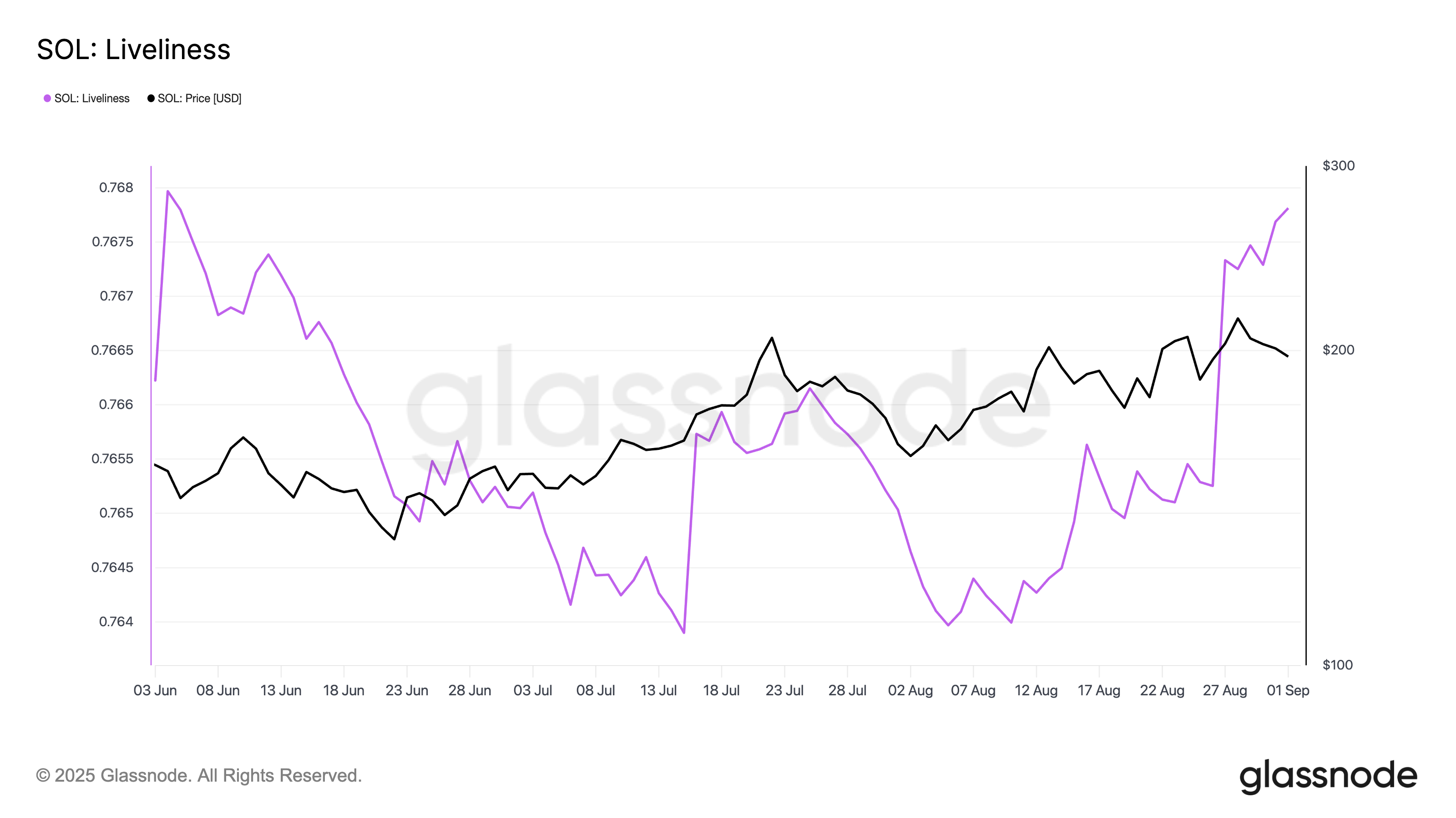 글래스노드에 따르면, SOL의 라이블리니스는 8월 초부터 상승세를 보이며 현재 0.76으로 3개월 만에 최고치를 기록하고 있습니다. 이는 가격 행동에 대한 하락 신호입니다.