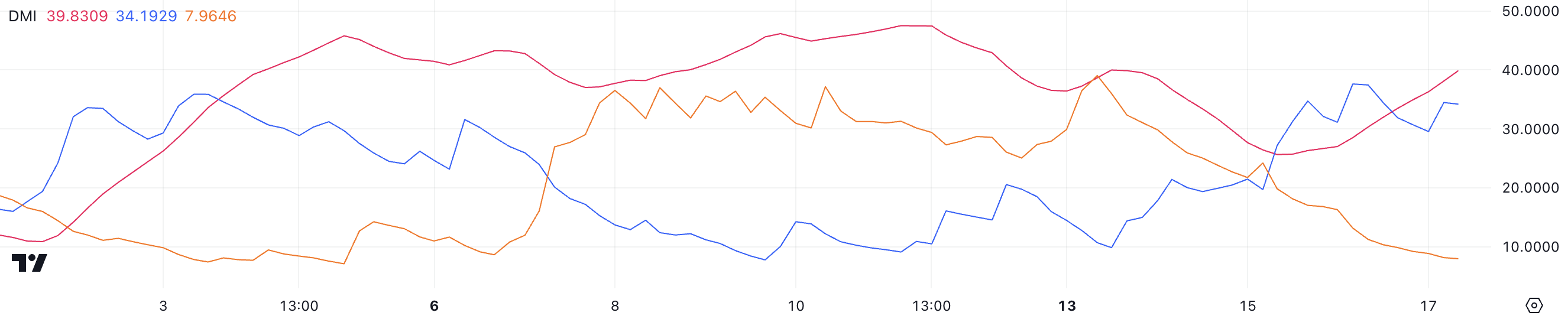 솔라나의 DMI(방향성 이동 지수) 차트는 ADX(평균 방향성 지수)가 지난 이틀 동안 25.6에서 39.8로 급상승한 것을 보여줍니다. 이 급등은 SOL의 현재 상승세 시작과 골든 크로스 형성과 일치합니다.