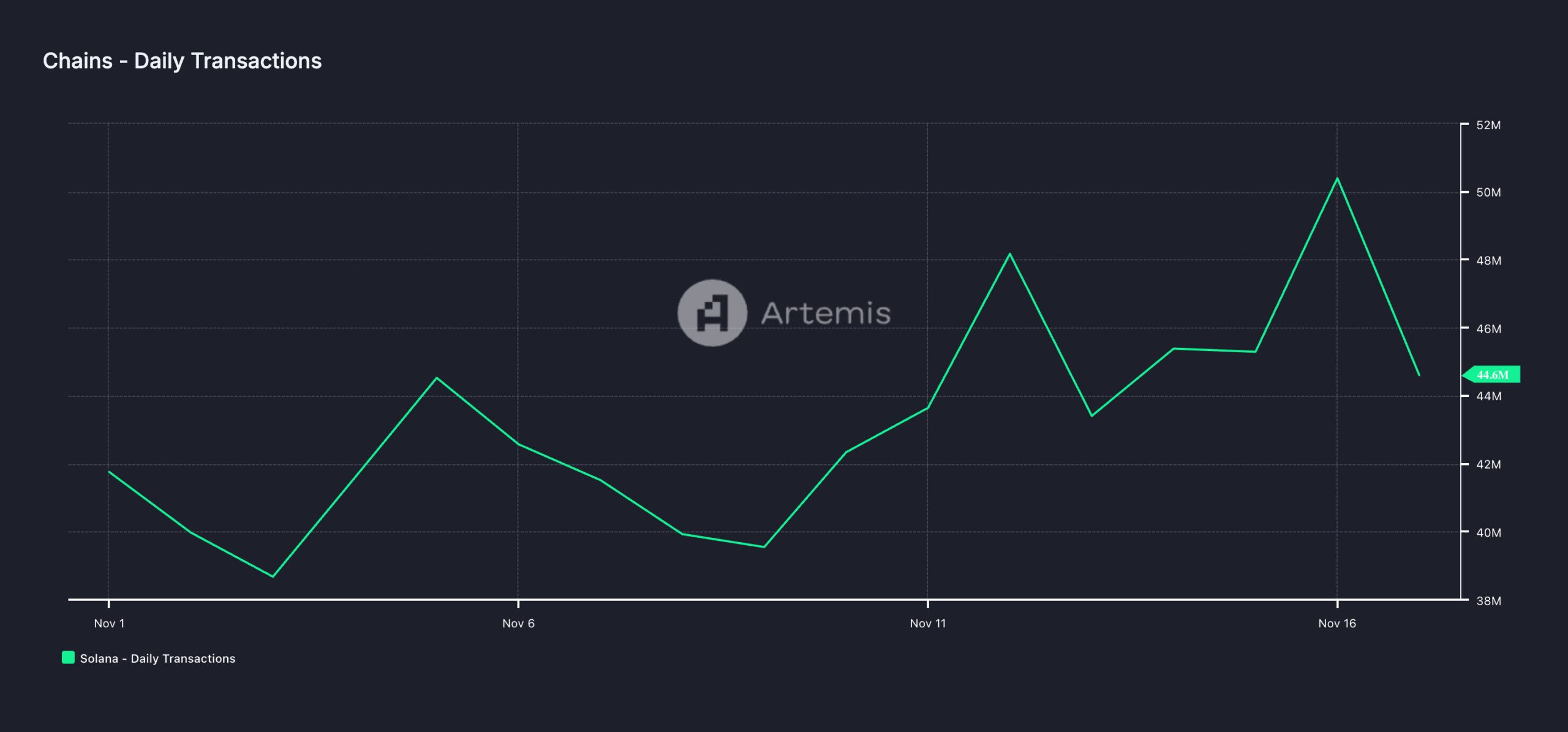 이러한 사용자 활동의 증가로 일일 거래량도 눈에 띄게 증가했습니다. Artemis 데이터에 따르면 지난 17일 동안 Solana는 4500만 건의 거래를 처리하여 7%의 증가율을 기록했습니다.