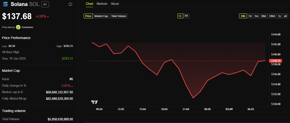 긍정적인 발전에도 불구하고, SOL 가격은 작성 시점에 거의 5% 하락하여 137.68달러입니다. 시장 변동성은 암호화폐에서 지속적인 요인으로 남아 있으며, 규제 불확실성과 거시경제 동향이 가격 움직임에 영향을 미칩니다.