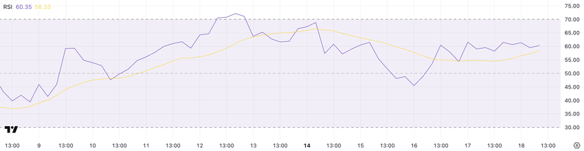 솔라나의 상대강도지수(RSI)는 현재 60.35로, 이틀 전 45에서 눈에 띄게 상승했습니다.