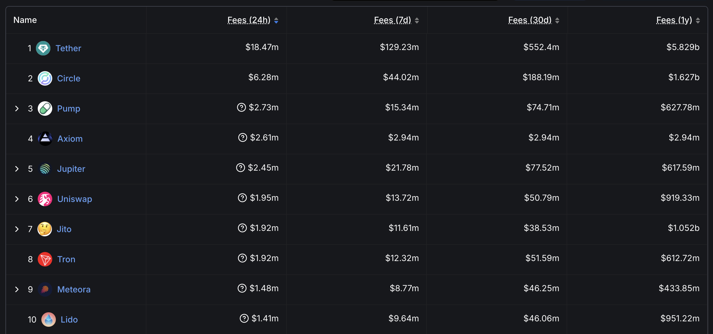 Pump는 특히 두드러지며, 지난 24시간 동안 273만 달러의 수수료를 생성했고, 지난 주 동안 1500만 달러를 기록했습니다.